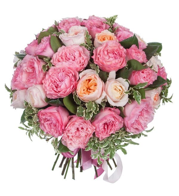 Bring elegance and fragrance into the life of someone special with this stunning bouquet. Place your order now and treat yourself or a loved one to the timeless beauty of peach and pink garden roses, complemented by lush greenery.