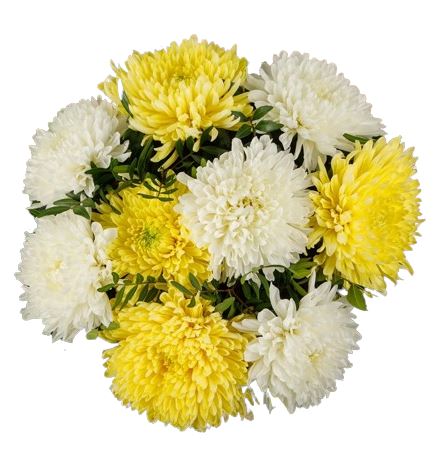 Imagine an exquisite mix of fluffy white chrysanthemums, symbolizing purity and innocence, paired with bright yellow blooms that exude warmth and joy.