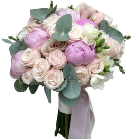 Capture timeless romance with our Pale Pink and Ivory Bridal Bouquet, a dreamy arrangement perfect for your wedding day. This delicate bouquet features lush pink peonies, elegant ivory spray roses, and fragrant white freesias, all beautifully accented with for a soft, natural touch.