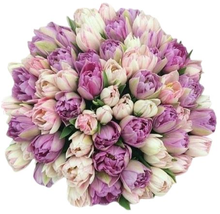 - Lavender Double Tulips: adds a touch of sophistication and tranquility to the bouquet. Their full blooms evoke a sense of peace and calm, offering a perfect complement to the light pink tulips.